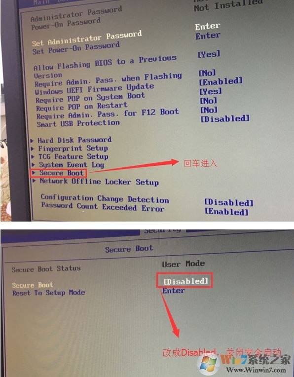 1、开机一直按F2或(FN+F2)进入BIOS,按→方向键切换到Security,选择Secure Boot回车设置成Disabled;