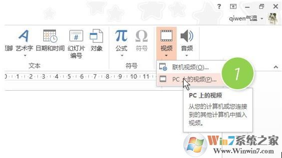 2、然后我们打开PowerPoint,然后新建一个幻灯片,或是打开原有的PPT,并插入一个视频。(点击视频,然后选择PC上的视频)
