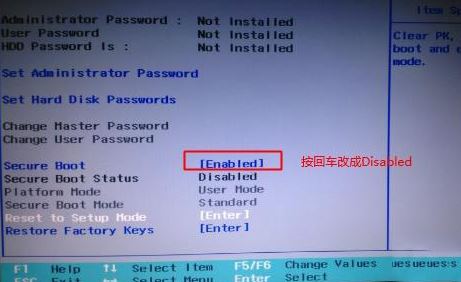 1、开机一直按F2或(FN+F2)进入BIOS,按→方向键切换到Security,选择Secure Boot回车设置成Disabled,如图所示: