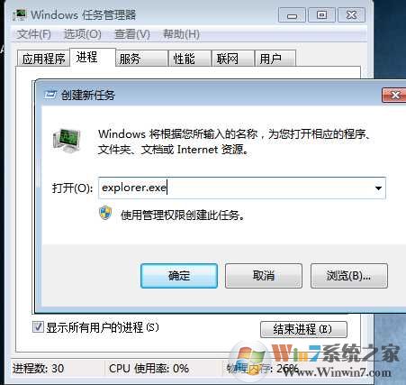 2、接下来,我们再点击windows7任务管理器上的 文件—运行 输入explorer.exe;