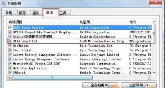 2、在“启动”选项卡中,找到“启动项目”为“ELAN Smart-Pad”把复选框中的对勾去掉。关闭ETD的开机启动。