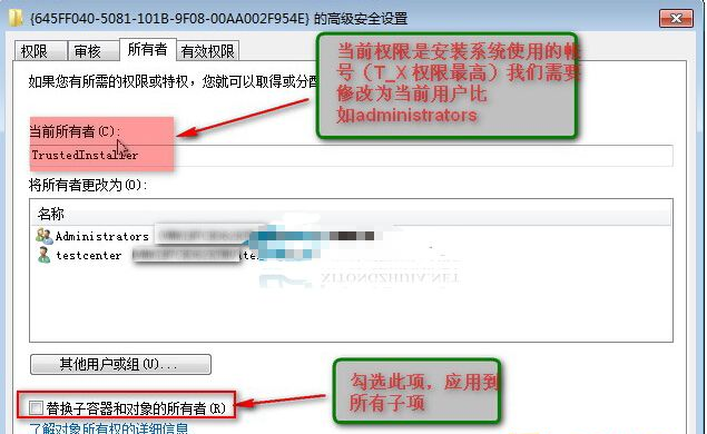 3、然后切换到“所有者”选项卡下,这时我们可以看到当前的所有者是“TrusteInstaller”这是一个Windows内部管理员帐户,权限非常高,而我们需要将把所有者更改为当前登录帐户,如Administrator,点击选择 将所有者更改为administrators,然后勾选替换子容器和对象的所有者(相当于把该注册表项下的子项都更改成当前所有者);