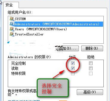 4、应用确定以后返回到权限窗口,选择当前用户账号我的是administrators(xxxxx\administrators,将完全控制的选项点击设置为允许,点击应用,现在尝试编辑注册表项目看看问题是否解决