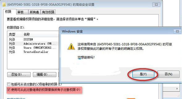 5、删除的时候如果还是提示出错请依次操作(右键需要操作的项-权限-选择当前的用户名--高级-权限选项卡,点击当前用户名并勾选使用可从此对象集成的权限替换所有子对象的权限---应用,确定)