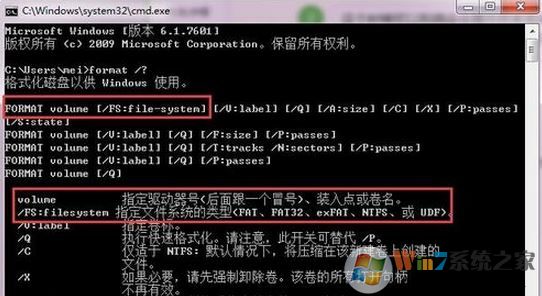 2、在命令提示符中键入:format /? 可以查找format相关的参数,如图: