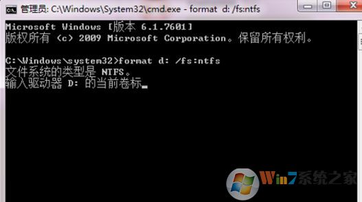 3、当前D盘出问题,所以小编是这么输入的:format d: /fs:ntfs 输入后按下回车键会提示输入当前驱动器的卷标: