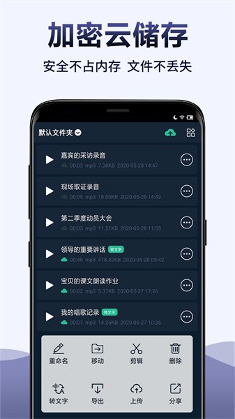 采用云端加密存储技术,防丢失,防误删,为您留住重要文件,解放您的手机内存~