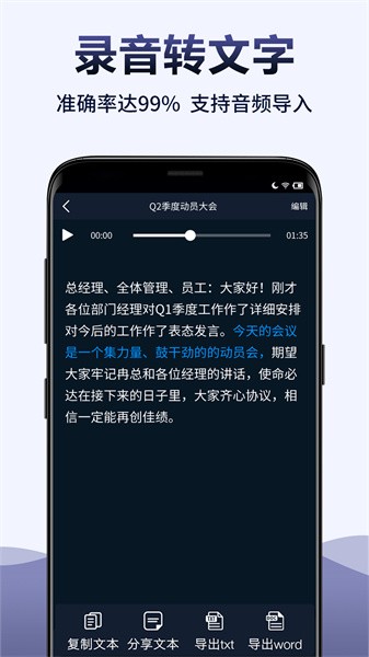 运用国内先进的ai技术,语音识别率达可达99%,再也不用手动打字整理录音内容啦!