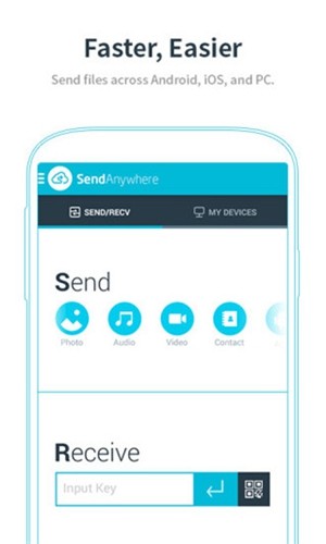 - 在接收设备上输入该密钥并立刻下载文件。支持照片、视频、音乐,以及文档和apk文件形式,并且也可以通过扫二维码来传输。6位密钥可在10分钟内有效