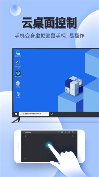 2、【TV模式登录】在具有电视设备的情境下,用户可在智能电视上安装VEGArena云电脑应用。并用此应用的“TV模式登录”进行账户登录,电视连入云电脑后,手机/平板即刻变身虚拟键盘,鼠标和游戏手柄,可对电视上的云桌面进行操作控制。电视变电脑,手机/平板变游戏手柄,游戏大作随时体验!