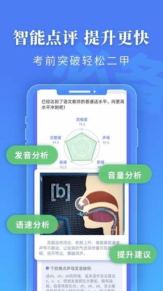 2.纠正发音巩固练习,提高普通话学习效率。 全真试题,AI智能语音技术模拟正式普通话考试,为参加普通话水平测试打好基础。