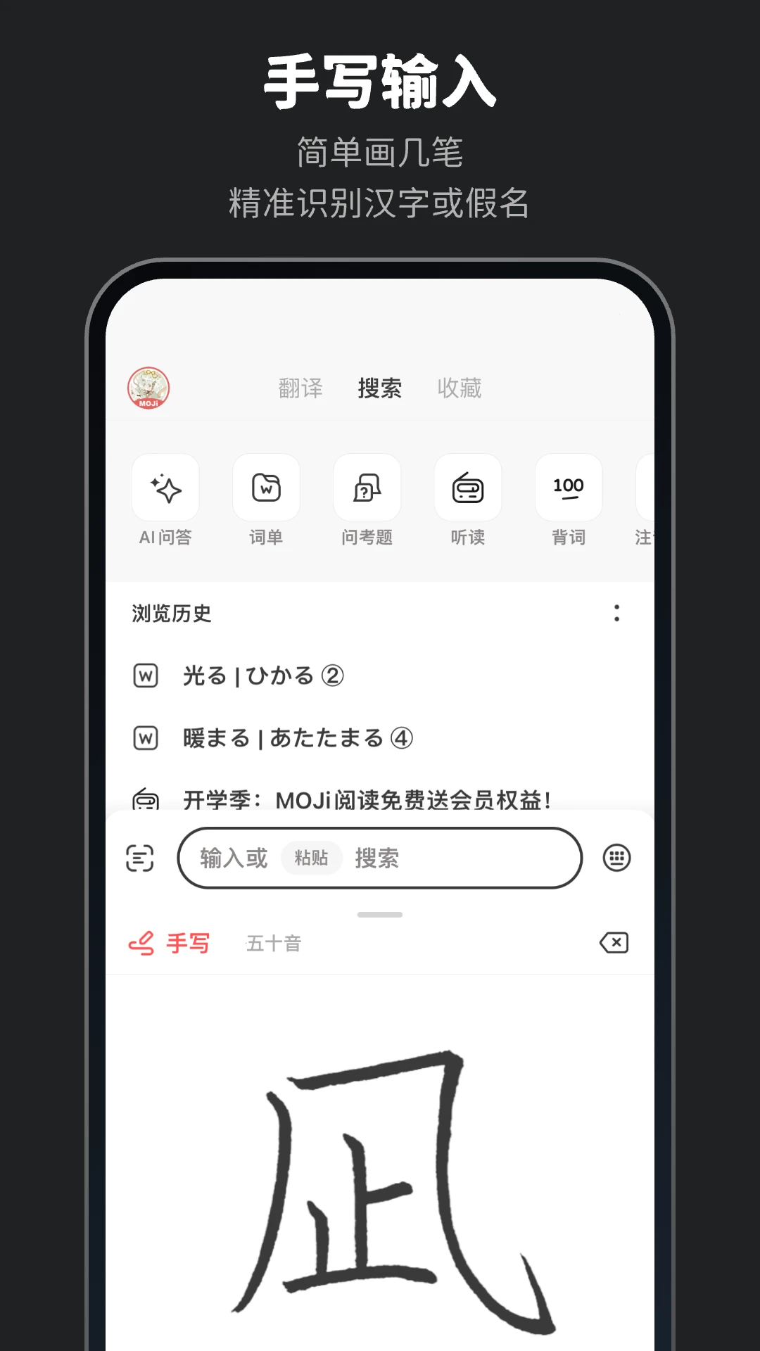 MOJi辞書APP是一款专业的日文词典软件,收录的日文词汇十分齐全,遇见任何不会的词汇都可以在这里进行搜索。支持手写功能,直接解决日文的输入障碍,直观简易的手写输入十分高效。翻译还能一键发音,并提供例句、解析,十分方便。感兴趣的小伙伴快来下载MOJi辞書开始学习吧。