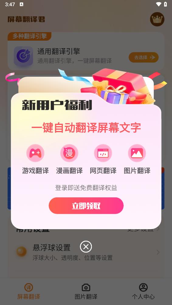 悬浮球设计——更易用,单击悬浮窗即可在任意界面全屏翻译,无需切换界面;支持自动翻译,快速翻译聊天输入框中的文字。