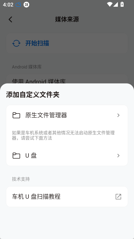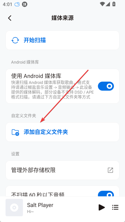 2、可以点击添加自定义文件夹来选择自己存放音乐的文件夹进行扫描