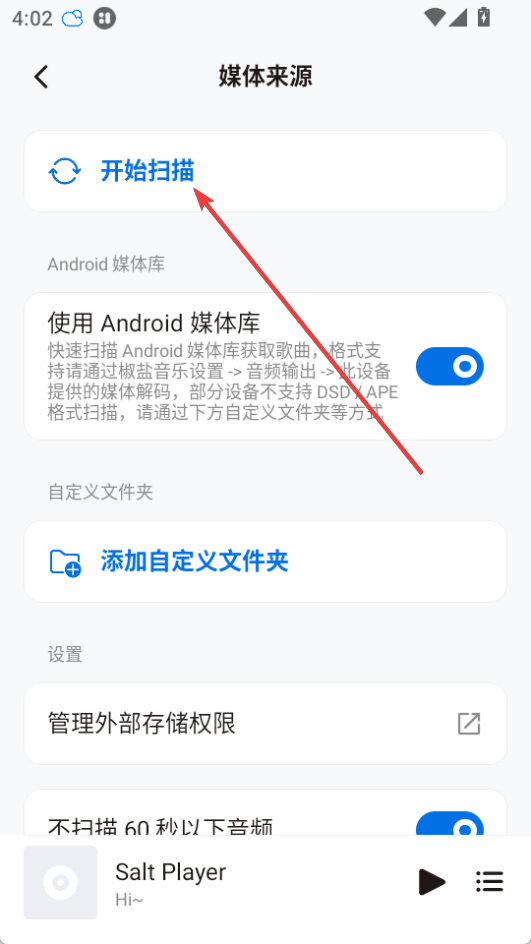 需要给椒盐音乐读取外部存储权限(确保,可以在系统应用设置查看是否授予此权限)。