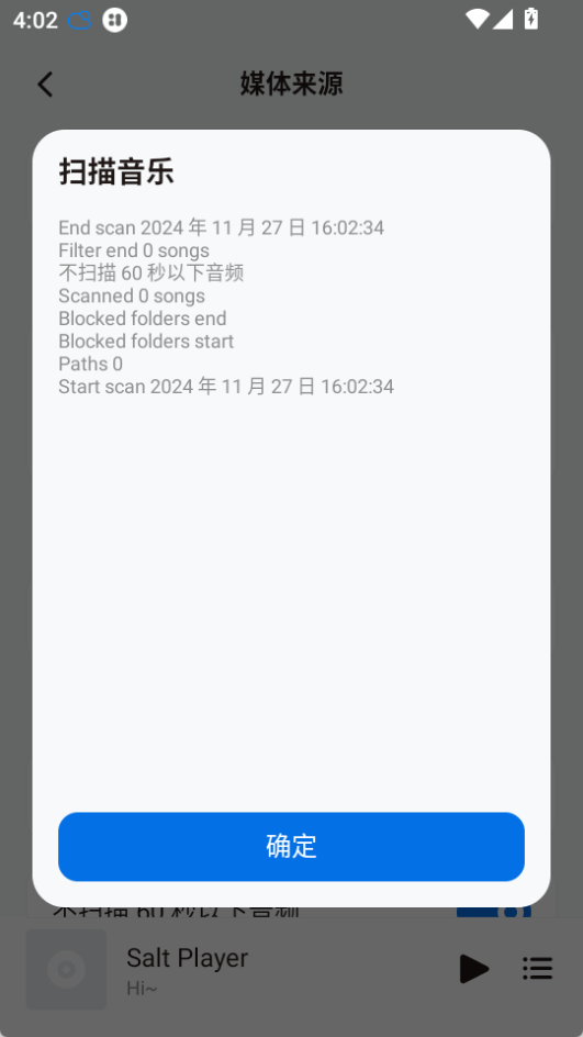 4、在点击【同意】授予权限后,点击【确定】就能扫描音乐了
