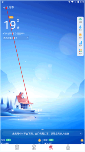 3、点击如图所示可以更换城市,了解你所在城市的天气情况。
