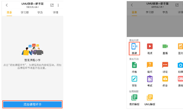 UMU课程可以通过学习群进行分享,也可以在目录中以多个小节的方式为学员提供学习内容、组织互动。在目录页点击“添加课程环节”,选择第一排第一项“微课”。