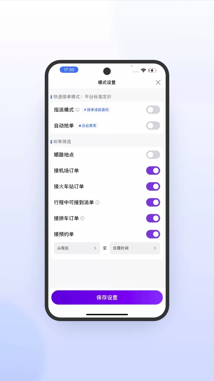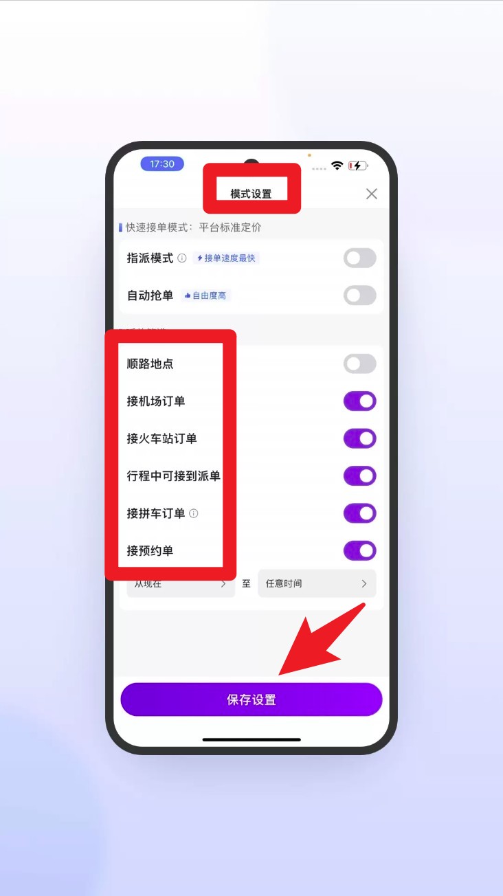 4. 点击底部模式按钮进入设置界面,可自由开关接单类型如预约单、接机场单等,最后别忘了保存设置。