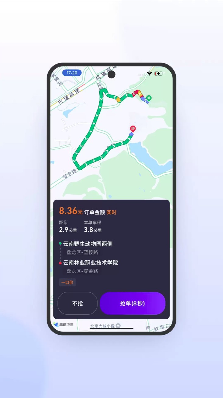 3. 接收到新订单后会显示地图导航及订单详情,点击抢单按钮即可确认接单,系统将进行时间倒数提醒。