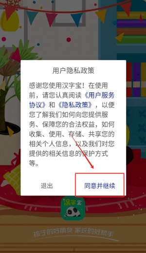 1、首先点击同意按钮,顺利进入应用界面,开始体验汉字学习的乐趣。