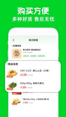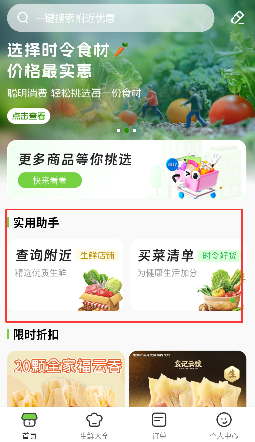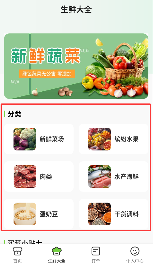 3、"生鲜分类"按蔬菜、肉类等8大品类细分,支持新鲜度排序和价格对比。