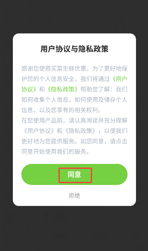 1、首次启动APP会显示用户协议弹窗,点击"同意"按钮后即可进入生鲜采购平台主界面。