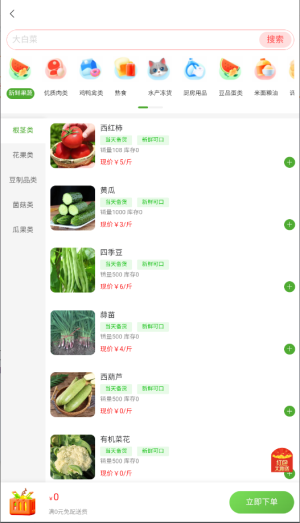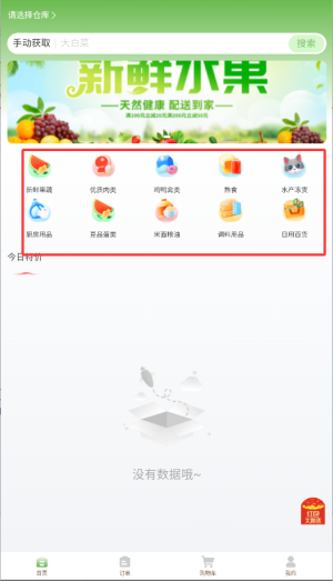 2、进入首页后,选择需要的商品分类,浏览各类生鲜食材和日用商品。