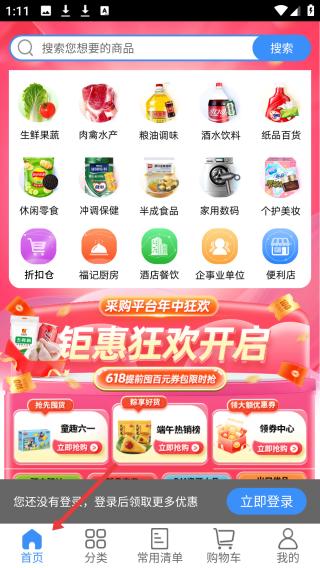 1、点击首页,设搜索栏与商品分类,正推年中狂欢活动,提示登录享更多优惠,购物便捷。