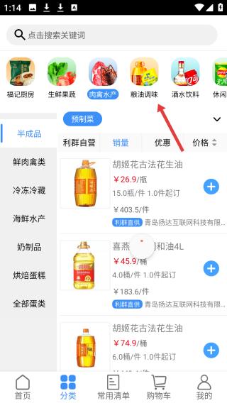 3、点击分类中的粮油调味区,展示胡姬花等品牌商品,含价格与起订信息,方便用户选购粮油。