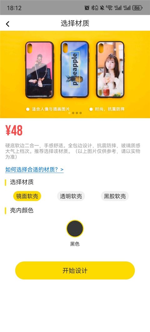 2、根据自己手机的品牌和型号,选择对应的设备机型,同时根据需要选择手机壳的材质类型,如透明软壳、磨砂硬壳等。