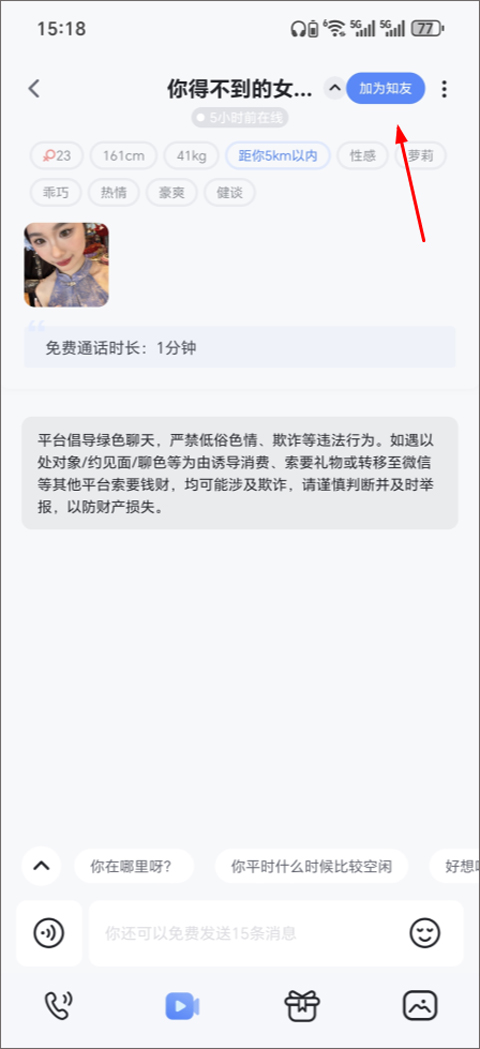 3、在聊天界面中,点击右上角的“加为知友”按钮,即可发送好友申请。
