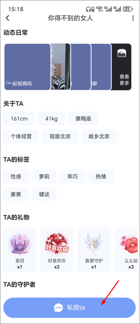 2、在个人主页下滑,找到并点击“私信ta”按钮,进入聊天界面。