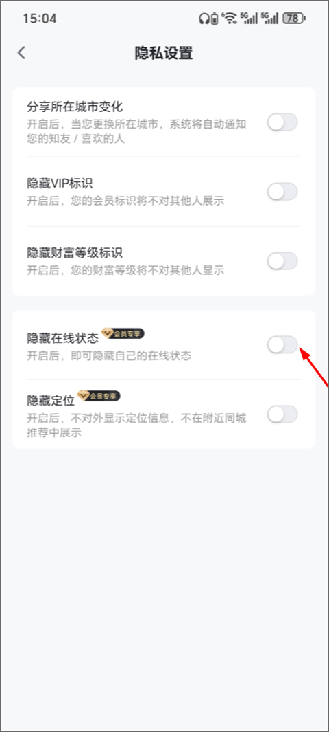 4、进入隐私设置后,找到“隐藏在线状态”选项,点击右侧开关按钮开启即可。需要注意的是,该功能需开通App会员才能使用。