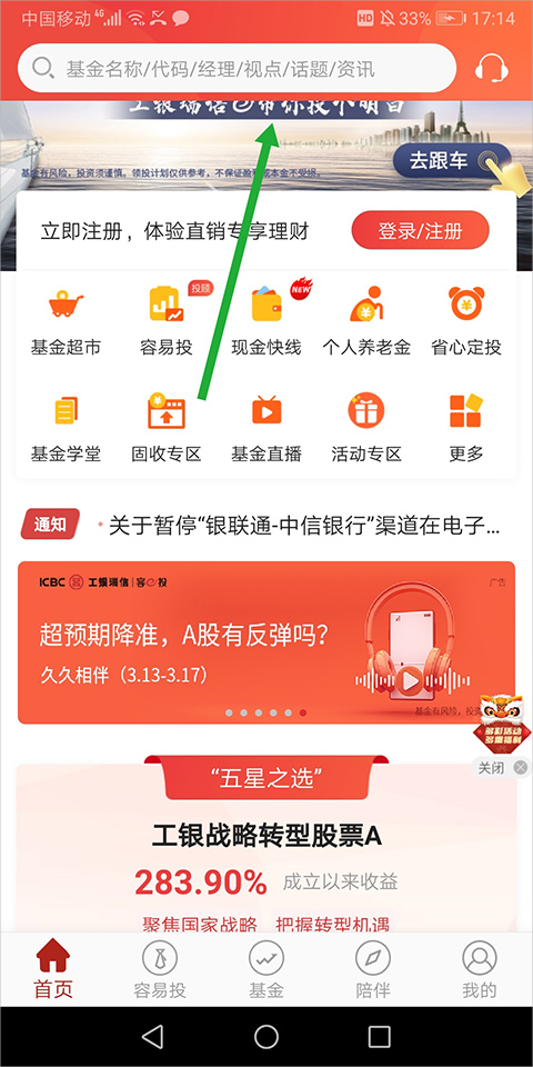 1、打开工银瑞信基金App,进入页面后点击页面顶部的搜索框。