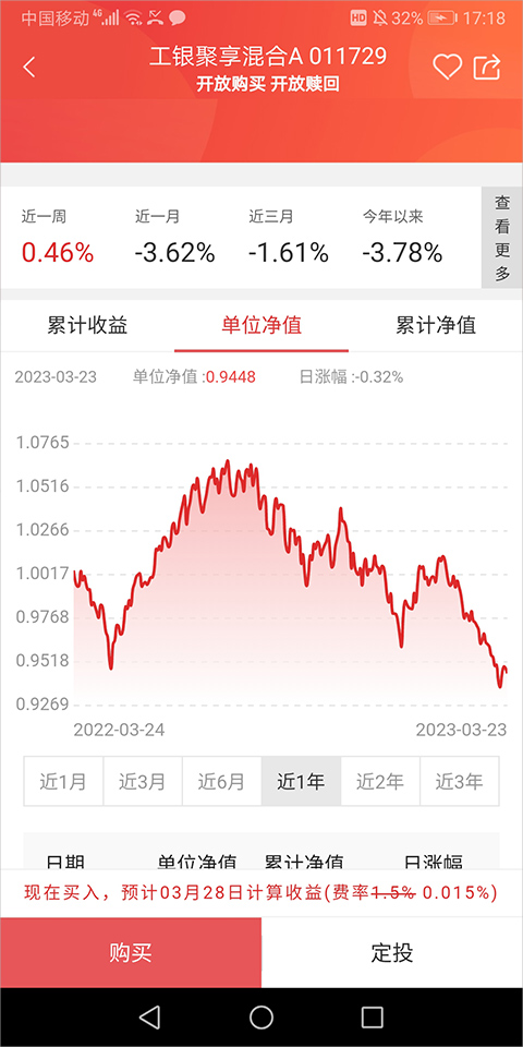 4、还可切换“单位净值”或“累计净值”,进行更详细的净值信息查询。