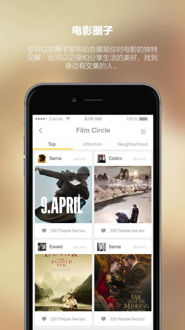 电影圈子。你可以在圈子发布动态展现你对电影的独特见解,也可以记录和分享生活的美好,找到身边有交集的人。