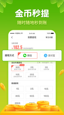 10000金币=1元,低至1元起提,提现方式支持微信或支付宝,两个工作日内到账。