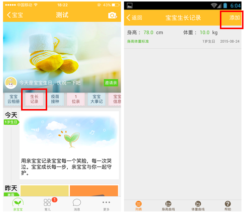 如果想知道自家孩子的生长发育情况在同龄人中出于什么水平,可以在生长记录中添加宝宝的身高体重数据。