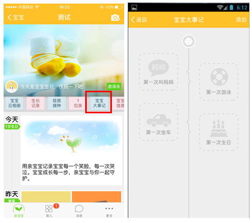 在首页界面点击宝宝大事记,还可以添加宝宝第一次叫妈妈,第一次走路等等第一次“大事”,我个人是觉得这块很实用,可以从日常的流水记录中提炼出每一个重要的成长印记。