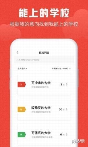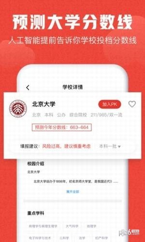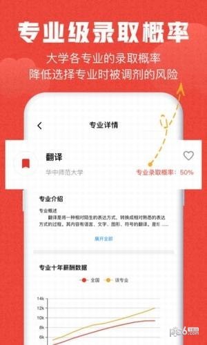 测录取概率:结合高考成绩和院校历年录取数据、高校录取难易度排行,帮助考生提前预测院校录取概率,控制落榜风险。