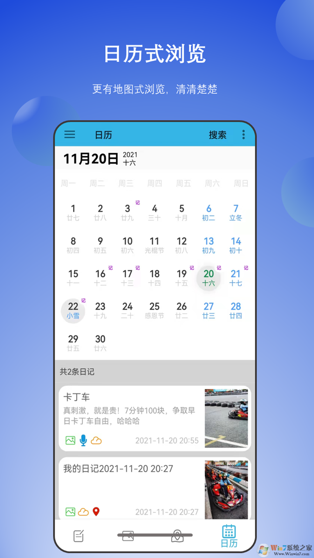 【日历】日历模式浏览日记,精确翻阅每一天的记录。