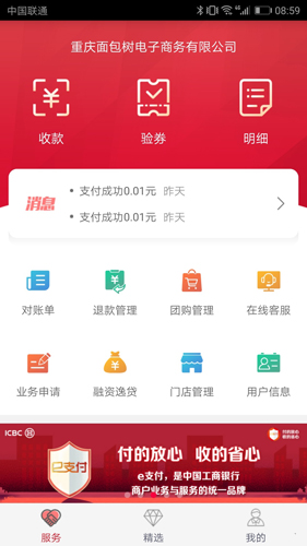 商户可通过本APP实现快捷的入账服务和多种支付结算方式,并支持线上退货等业务,把传统结算业务开上互联网高速路;