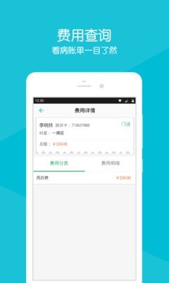 1、费用查询:可查询一年内所有就医消费记录,花费明细一目了然;