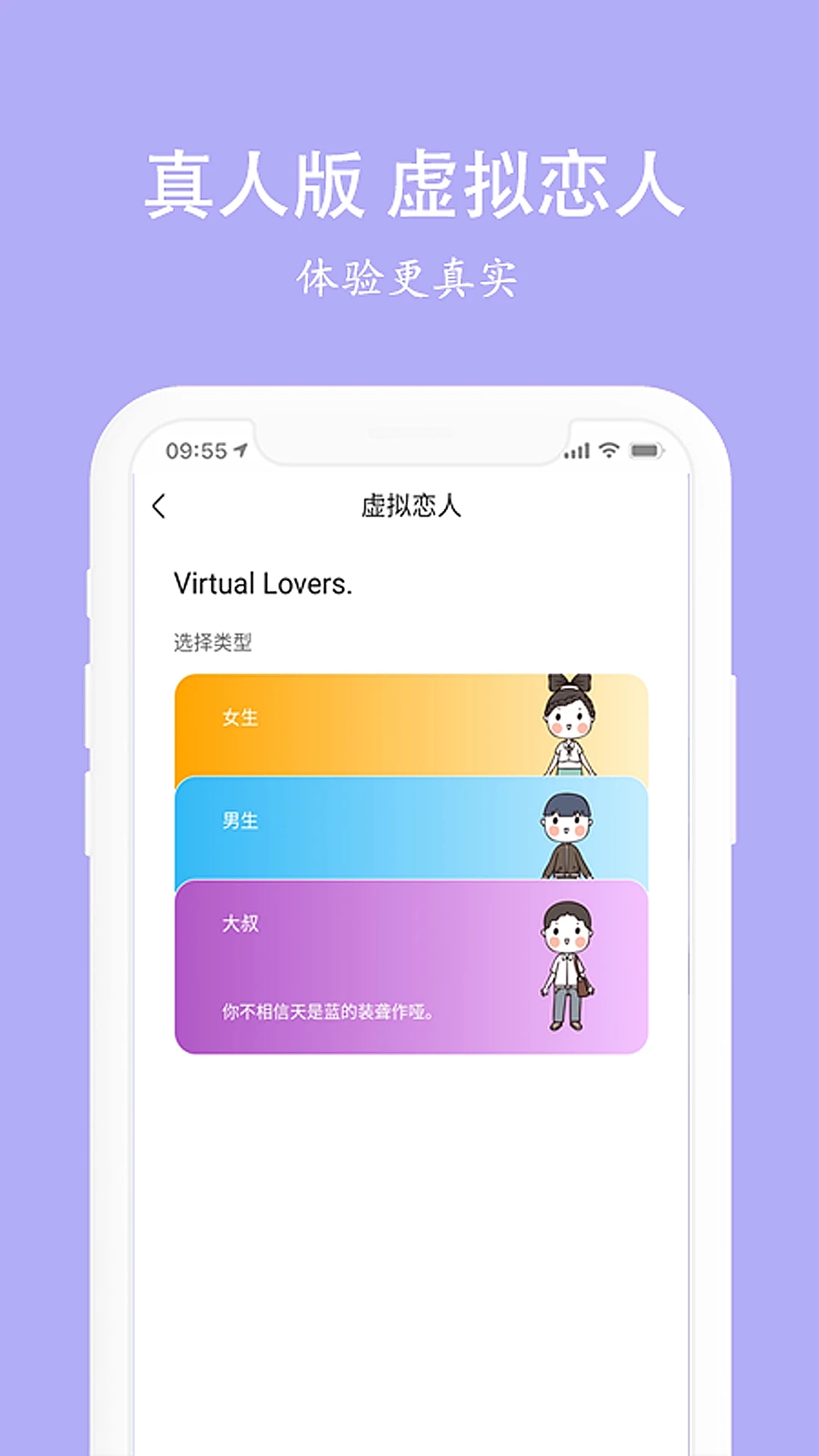 2、 多样化的角色选择:虚拟恋人APP提供多种不同类型的角色供用户选择,包括不同性别、性格、外貌等特点。用户可以根据自己的喜好选择与之互动的虚拟恋人。