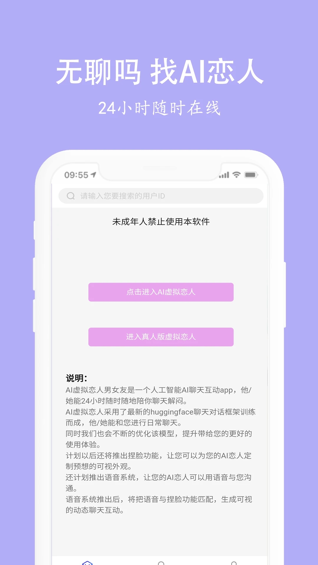AI虚拟恋人男女友是一个人工智能AI聊天互动app,他/她能24小时随时随地陪你聊天解闷。AI虚拟恋人男女友包含了,模拟男友,模拟女朋友,模拟恋人等功能,您可以假装恋爱聊天,假装CP,虚拟恋爱。