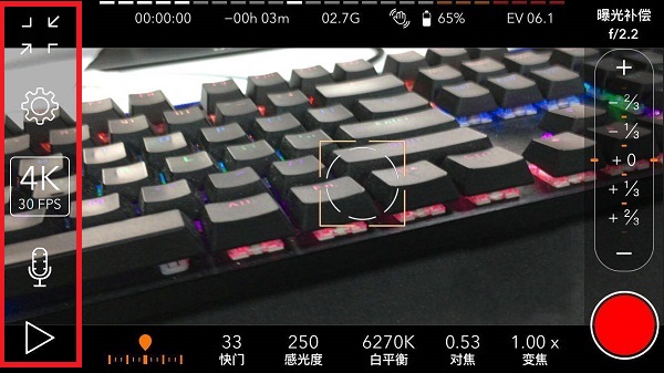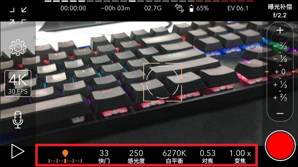 2、底部功能栏可以更改快门、感光、白平衡、对焦、变焦等参数。