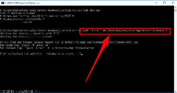 14、待我们的设备列举出来后,输入命令“.\adb -d shell sh /data/data/me.piebridge.brevent/brevent.sh”,从而完成我们对黑阈手机端的授权;
