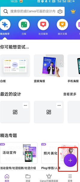 1、打开canva可画后,我们点击界面中的【+】,就能进入到选择的界面,如图所示: