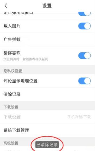 在设置页面,往下滑动页面,在隐私权设置,点击【清除记录】就可以清除浏览器的相关数据。